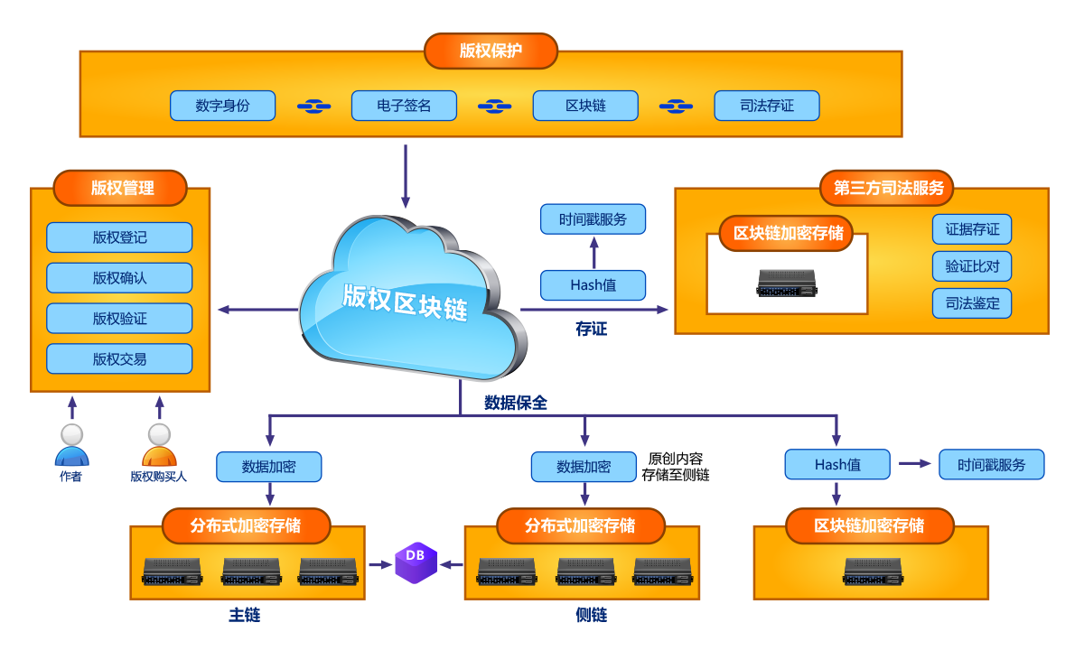 利用区块链、加密签名和时间戳等技术,实现版权保护;利用侧链技术实现与作者信息、原创内容(文档、图片、电子书、视频等)等数据一起打包存储到侧链上,通过受理号与主链进行关联。